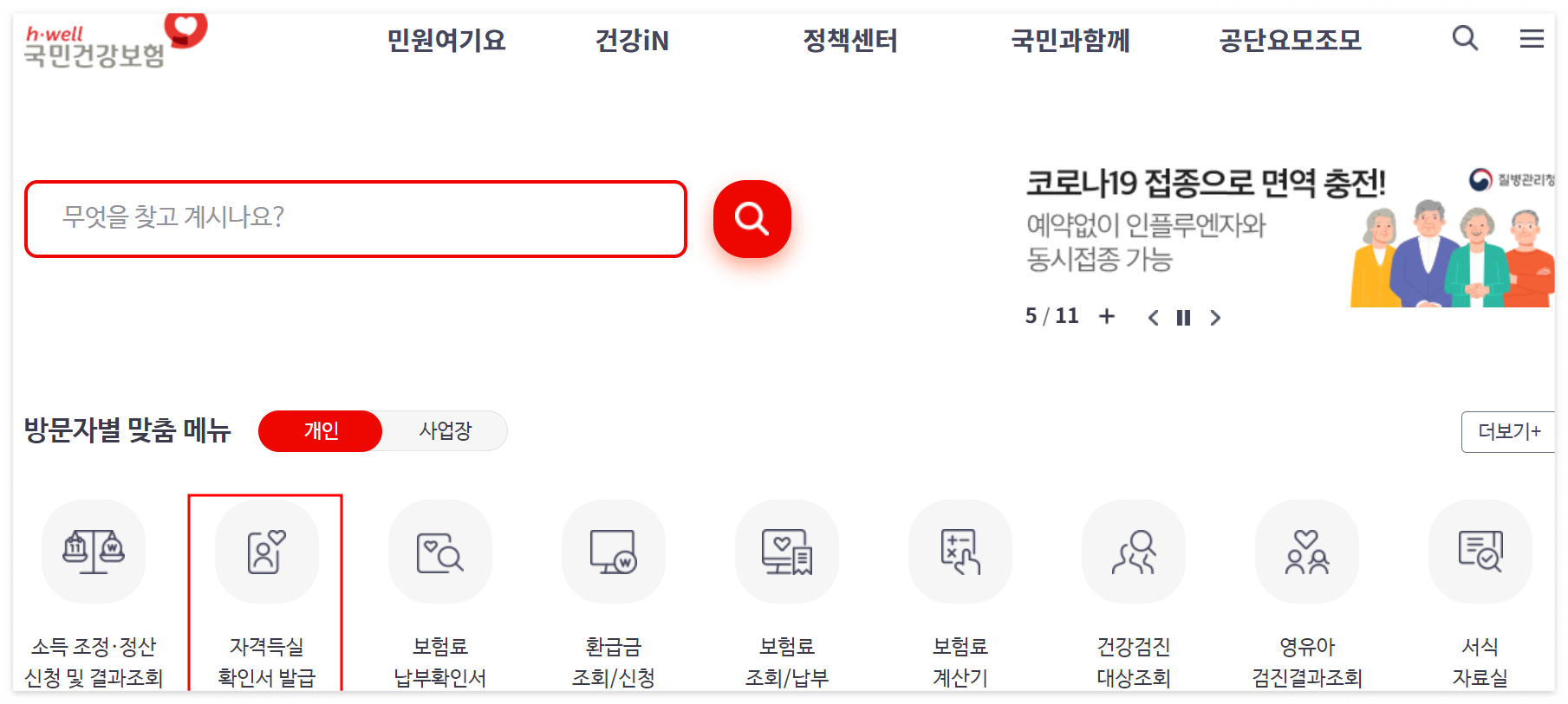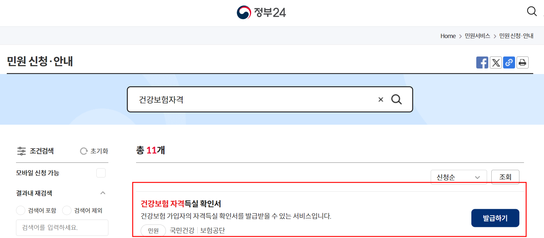 ② 민원 신청/안내를 누르신 후 검색창에 건강보험자격득실 확인서를 적으신 후 엔터를 누르시면 바로 발급하기 버튼을 확인하실 수 있습니다.