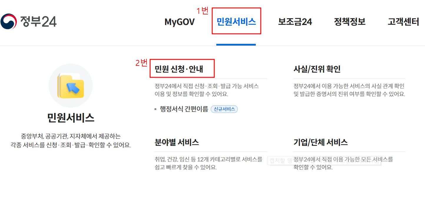 ① 정부 24 홈페이지에 들어가서 로그인 합니다. 메인 페이지에 있는 민원서비스 → 민원신청/ 안내 버튼을 누르면 됩니다.