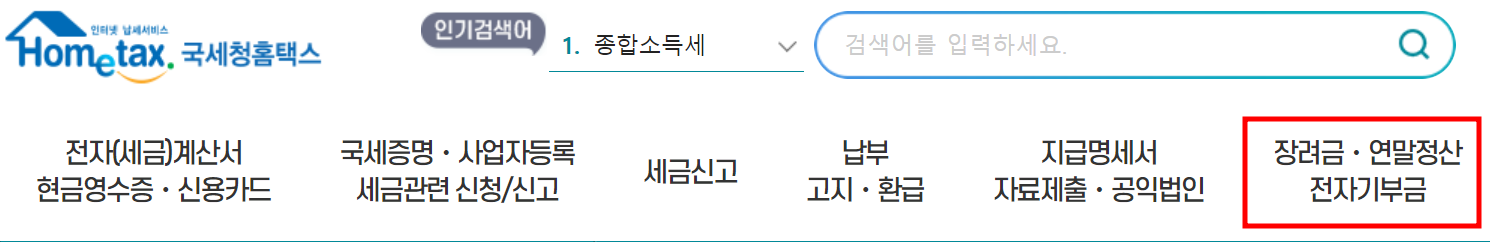 홈택스 홈페이지 > 장려금/연말정산/전자기부금 > 로그인 > 관련자료 제출 > 장려금 신청