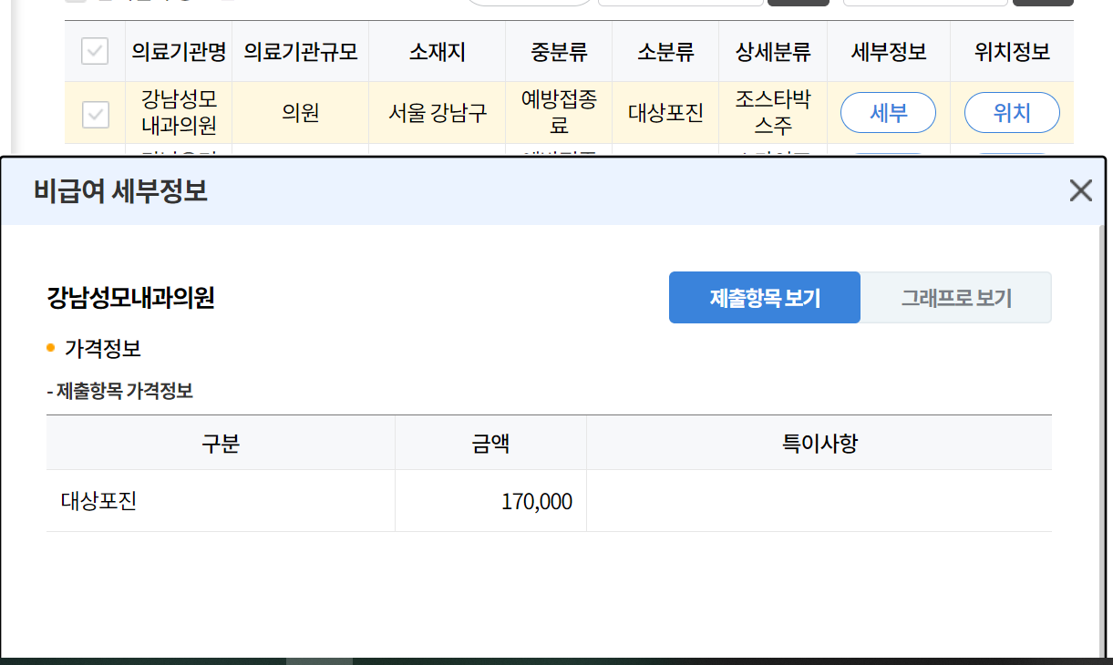 건강보험공단 홈페이지에 가시면 아래의 사진처럼 현재 거주하고 있는 곳 주변 병원의 백신가격을 미리 알 수 있습니다. 병원마다 전화하여 가격을 묻지 않아도 되어 편리하니 꼭 먼저 확인해 보시고 예방접종을 맞으러 가시기 바랍니다. 주사종류와 가격 그리고 병원 위치까지 상세히 나오니 꼭 클릭해 보시고 가격이 저렴한지 알아보세요. 가격비교는 생백신만 가능하며 사백신은 최근에 출시됐기 때문에 병원마다 전화해 보셔야 합니다.