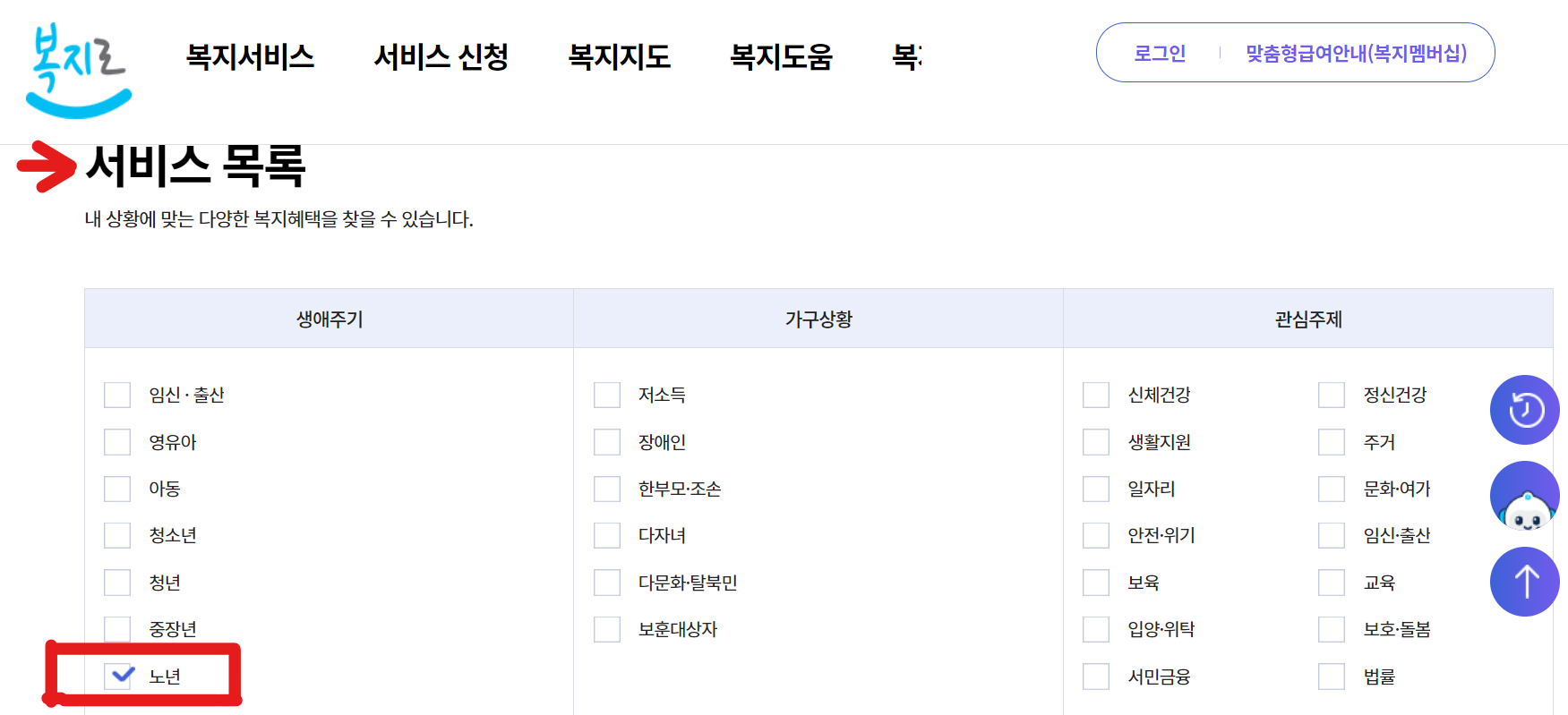 ② 복지서비스 → 서비스 찾기 → 서비스 목록