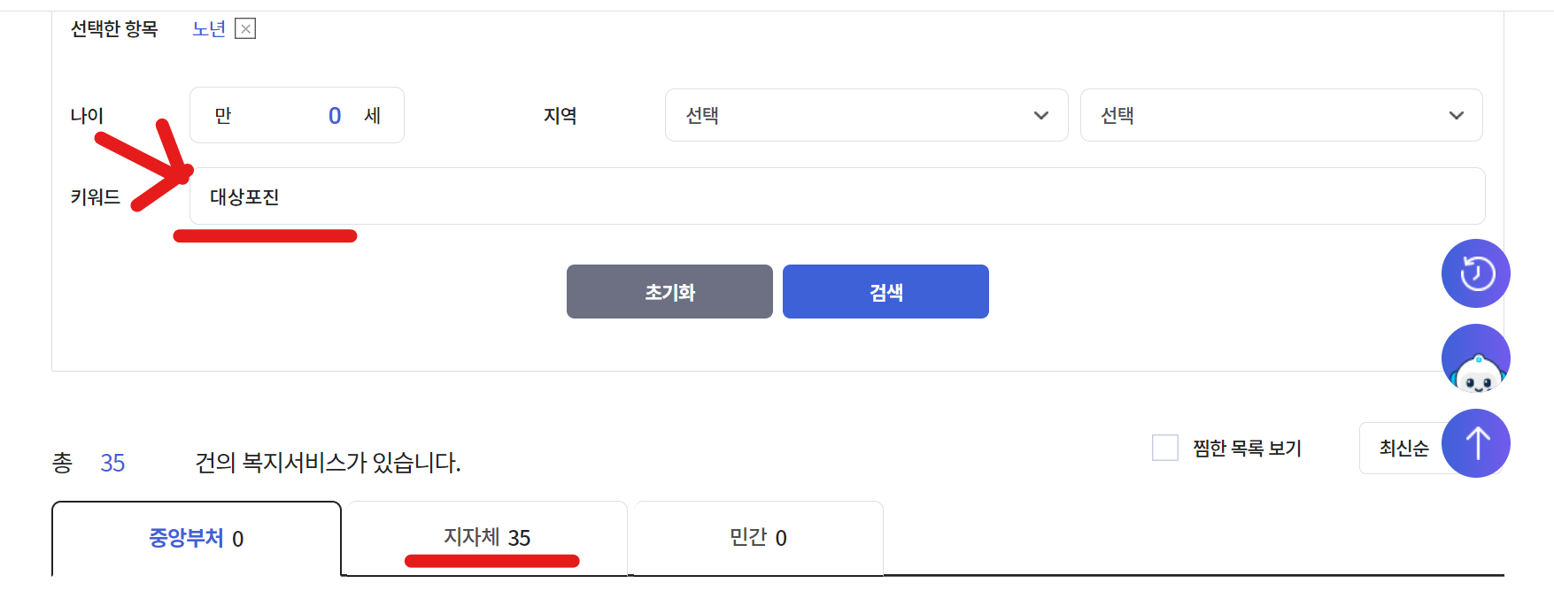 거기서 '노년'에 클릭하시고 키워드 창에 '대상포진'을 적으시면 대상포진 무료접종을 실시하는 35개의 지자체를 알아보실 수 있습니다.