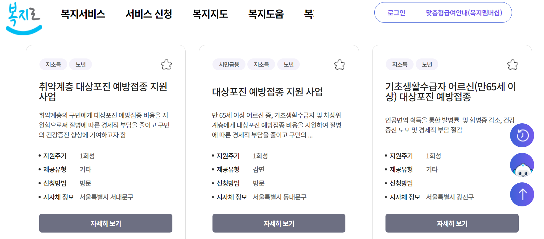 ① 복지로 사이트에 가시면 사진에서 보시는 것처럼 지자체별로 무료접종을 안내하고 있습니다.