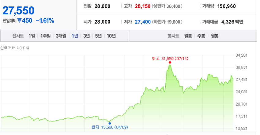 올해 4월 최저 15천원에서 10월 현재 27천원까지 오르며 코스피 3천시대에 걸맞은 만큼 올랐습니다.