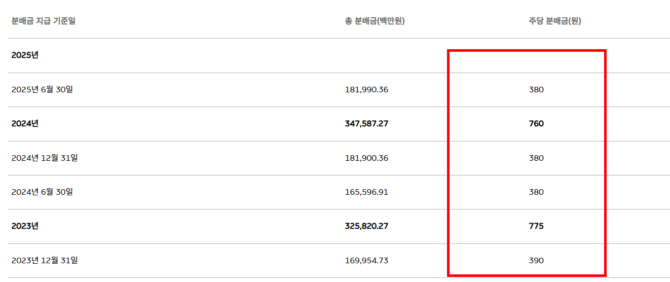 4. 배당 지속성: 2025년 상반기의 분배금이 안정적 수준(380원)을 유지했고, 운용수익 + 순이익이 증가함에 따라 분배 여력이 괜찮다는 평가 가능.