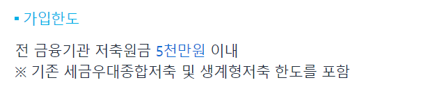 한도는 기존에 가입하신 세금우대종합저축 및 생계형저축 한도도 포함됩니다.