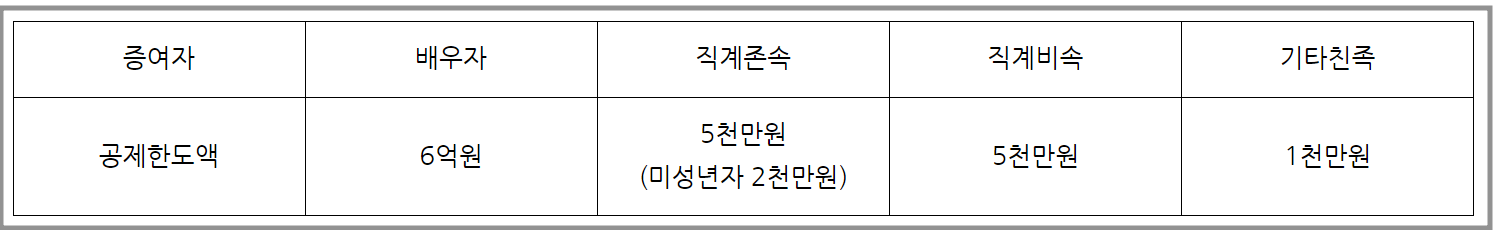 배우자는 6억, 아들 딸은 5천만원(단, 미성년자는 2천만원), 직계비속은 5천만원, 기타친족은 1천만원의 공제한도액이 적용됩니다.