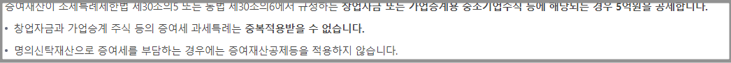 하지만 창업자금과 가업승계 주식 등의 증여세 과세 특례는 중복 적용되지 않습니다.