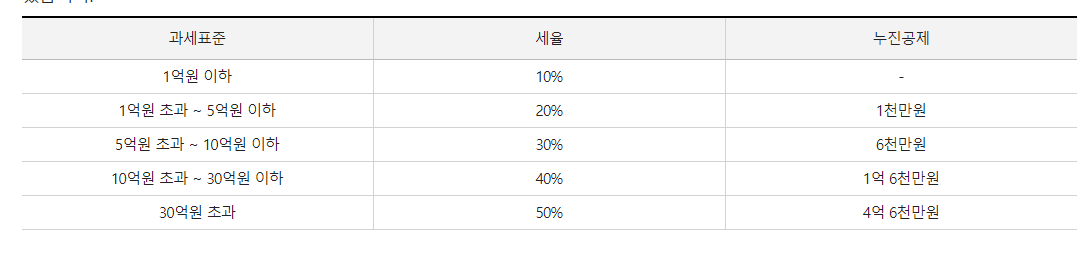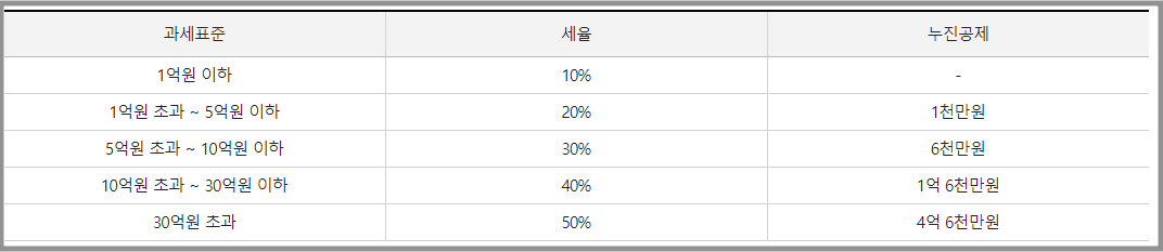 증여세는 일억원 이하는 세율 10% 부터 30억원 초과는 50%의 세율로 총 5구간으로 나눠집니다.