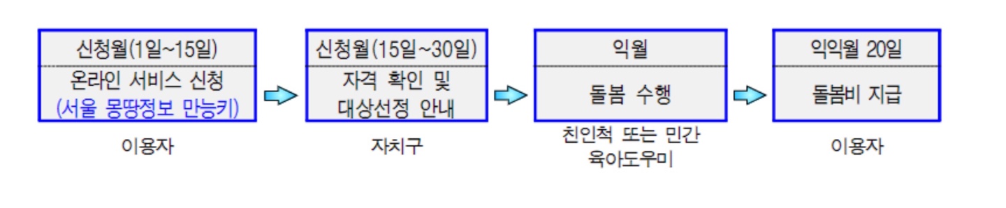 예를들어 9월에 신청하면, 9월 중 ' 대상자 선정알림' 10월에 '돌봄활동 수행' 11월에 '돌봄비지급' 순서로 진행됩니다.