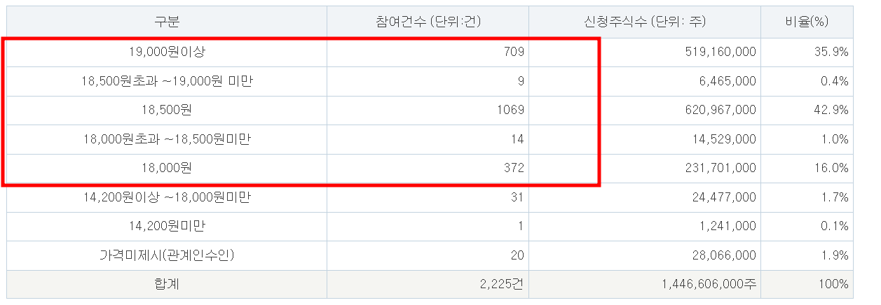 대부분 18,000원 이상의 금액으로 참여하여서 높은 공모가를 형성하였습니다.