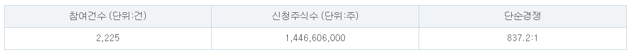 경쟁률은 837.2 대 1이며 이정도의 경쟁률은 납입 여력이 되는 기관들만 투자하는 방식으로 변경되었으므로 충분히 경쟁률이 잘 나왔다고 생각됩니다.