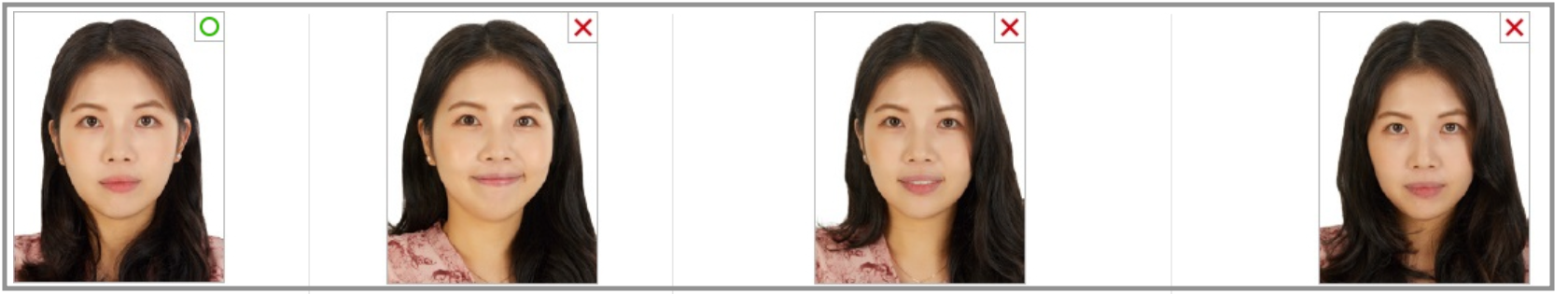 2. 머리를 기울이거나 얼굴을 가까이 근접 촬영한 사진은 사용 불가합니다.