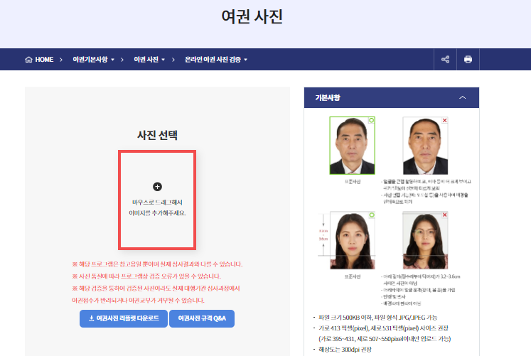 외교부홈페이지에서는 가지고 있는 사진이 여권사진으로 적합한지 미리 알려주고 있습니다.