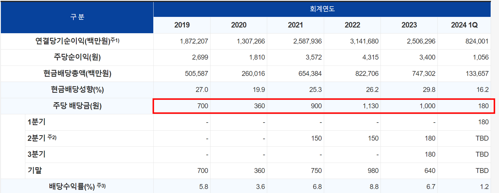 23년 2분기 180원, 3분기 180원을 제외한 4분기 결산배당은 640원 입니다.