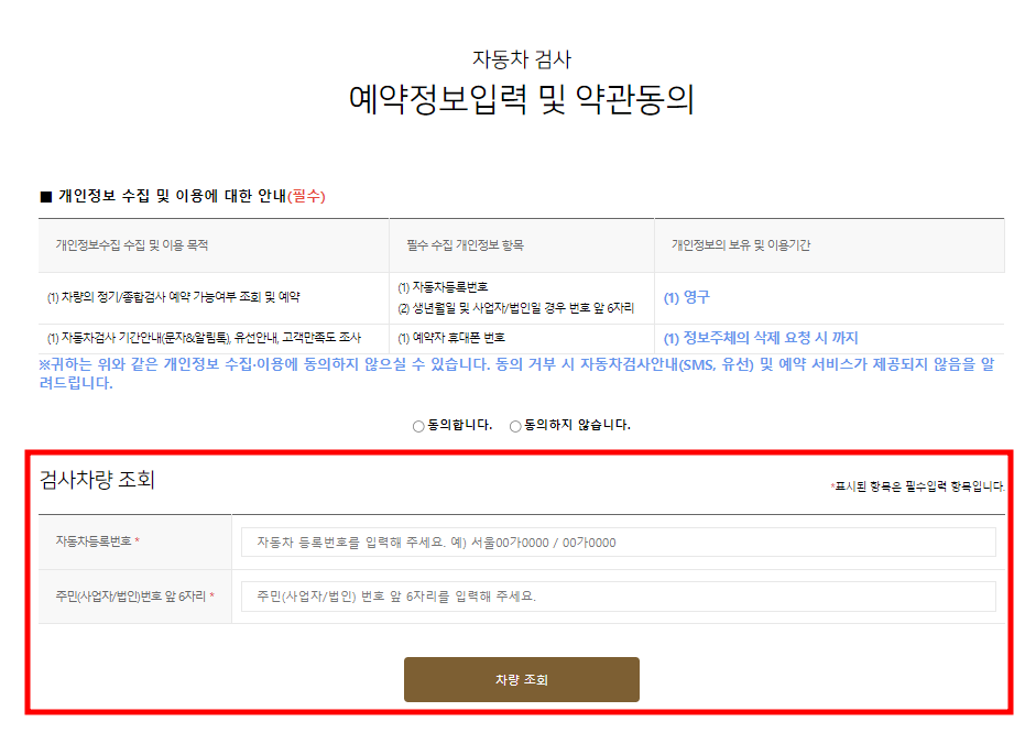 3. 자동차 검사 예약하기를 누르시면 예약정보입력과 약관동의 페이지가 나옵니다.