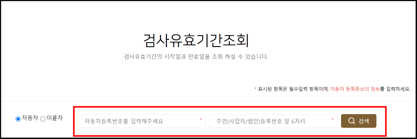 검사유효기간조회 창이 나오면 밑에 자동차등록번호와 주민번호 또는 사업자/법인 번호 앞자리 6자리를 누르시면 검사를 받을 수 있는 기간이 조회 됩니다.