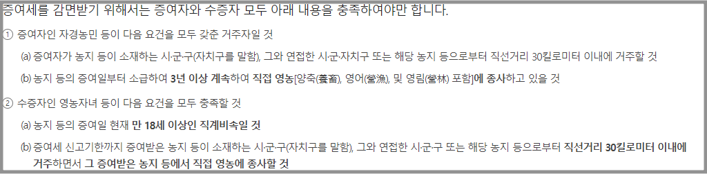 1. 증여일로부터 3년 이상 지속적으로 영농업에 종사하여야 합니다.