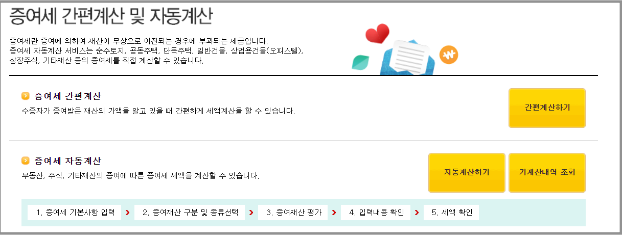 국세청에서는 복잡한 증여 계산법을 미리 알아볼 수 있도록 증여세 자동계산 프로그램을 제공합니다.