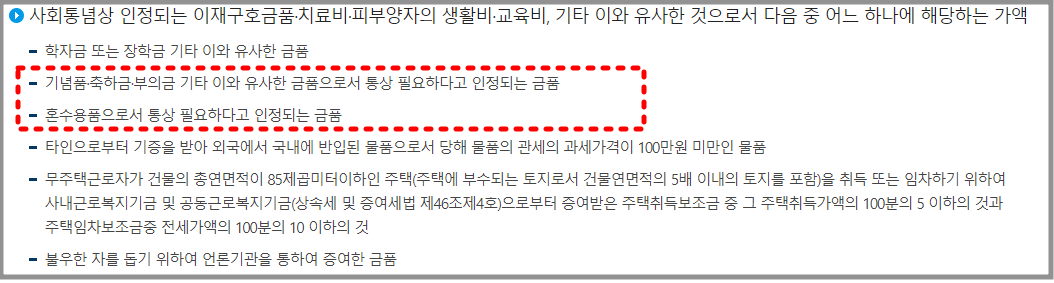 결혼할 때 필요한 혼수용품, 축하금, 기념품 그리고 부의금 등은 증여세에서 제외되어 면제 받을 수 있습니다.