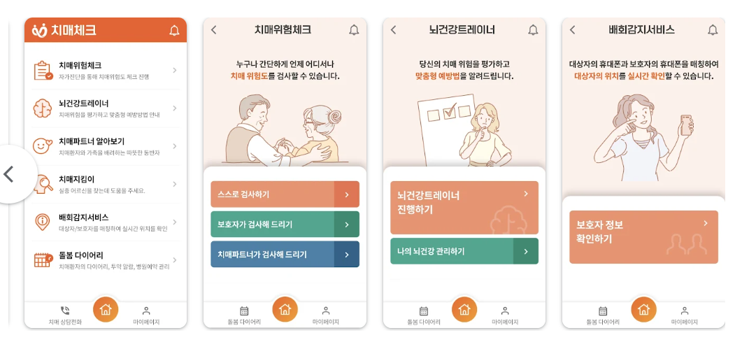보건복지부에서는 치매체크 앱을 통해 치매위험을 스스로 체크하며 치매어르신의 배회감지서비스도 제공하고 있습니다.