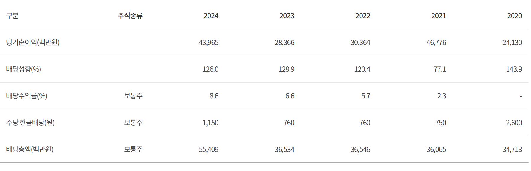 배당금은 실적 개선에 따라 조정되며, 예를 들어 2024년 1분기에 이전의 분기 배당금(190원)에서 250원으로 올린 바 있고요.