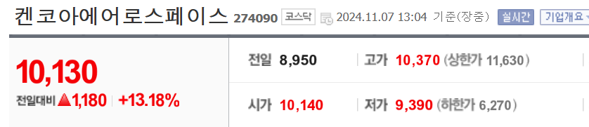 켄코아에어로스페이스는 우주관련주입니다. 대통령당선 다음날 14%가 오른 켄코아에어로스페이스는 트럼프가 우주/항공에 진심이기 때문에 우주 상업화 가속으로 인한 기대로 트럼프관련주로 여겨지고 있습니다.