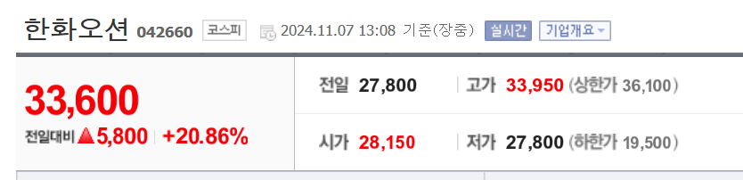 트럼프 당선 다음날 20%이상 상승한 한화오션은 트럼프가 한국의 조선사업과 협력하겠다는 발언을 윤석열대통령과의 통화에서 한 만큼 조선 업계도 수혜주로 분류되었습니다.