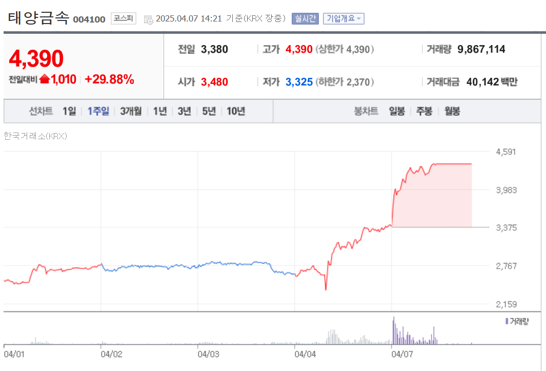 태양금속은 4월 7일 상한가를 기록하고 있는데요. 한동훈 테마주 중 가장 급진적인 주식 중 하나입니다.