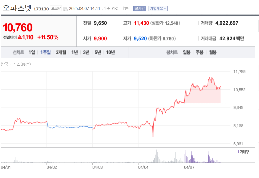 오파스넷은 신동훈 사외이사가 한동훈 전 장관과 37회 사법시험 동기라는 부분에서 관련주로 편입되었습니다. 주가의 흐름을 보면 부방과 비슷하게 가고 있는 것을 알 수 있습니다. 4월 1일부터 계속 우상향입니다.