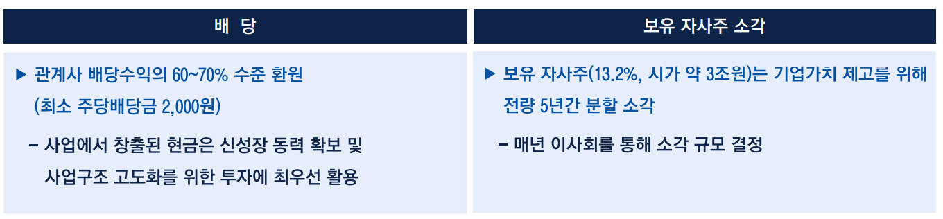 또한, 기업 가치 제고를 위한 적극적인 자사주 소각 정책도 추진하고 있습니다. 보유 중인 자사주는 향후 5년 동안 분할 소각될 예정이며, 소각 규모는 매년 이사회에서 심의 및 결정됩니다. 대상 주식은 보통주 24,718,099주(전체 발행 주식의 13.2%)와 우선주 159,835주(전체 발행 우선주의 9.8%)입니다.