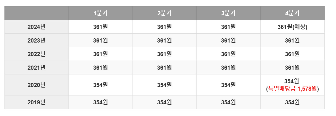 | 주가배당금 | 361원 | 362원 | 361원 | 361원 | 361원 | 361원 예상 |