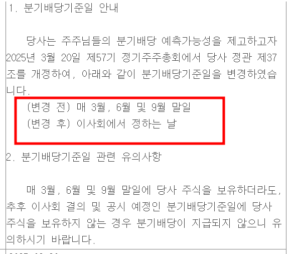 현대차는 작년까지는 3월, 6월, 9월 말까지 주식을 가지고 있었다면 배당금을 받을 수 있었습니다. 하지만 올해부터는 이사회가 결정한 날을 배당기준일로 변경한다고 주주총회에서 발표하였습니다.