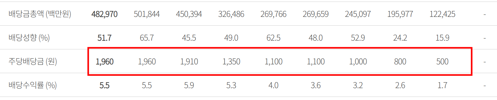 | 1주당 배당금 | 1,100원 | 1,350원 | 1,910원 | 1,960원 | 1,960원 |