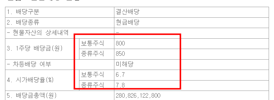 | 배당금 | 500원 | 500원 | 700원 | 1,050원 | 700원 | 800원 |