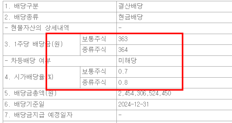 삼성전자는 363원의 배당금을 지급하며 우선주와는 1원 차이가 납니다. 하지만 주가가 다른 만큼 배당수익률은 2.8%로 약 0.4%차이를 보여줍니다.