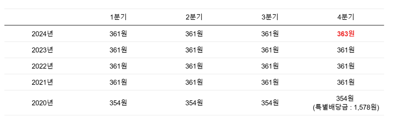 | 배당기준일 | 3월 31일 | 6월 30일 | 9월 30일 | 12월 31일 |