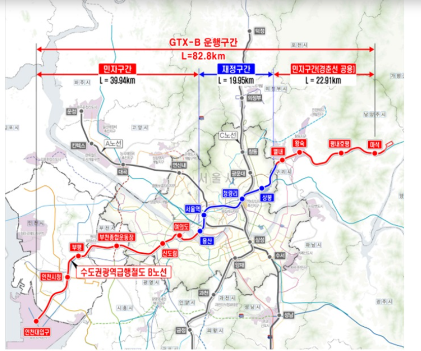 올해 상반기에 착공하여 30년에 마무리 짓고 개통할 GTX B는 공사기간 60개월 내 민자사업 4조 3천억 원과 재정사업 2조 5500억원 총 6조 8500억원이 드는 공사입니다.