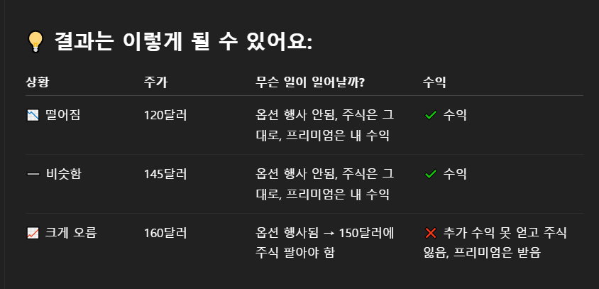 3. 크게 오름: 160달러 옵션 행사됨 → 150달러에 주식 팔아야 함 ❌ 추가 수익 못 얻고 주식 잃음, 프리미엄은 받음