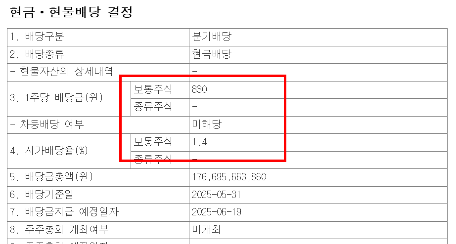 배당금: 1분기 배당금은 주당 830원으로 결정되었으며, 기준일은 5월 31일입니다. 이는 주주환원 정책의 일환으로, 배당 예측 가능성을 높이기 위해 정관을 개정하여 사전에 배당금을 결정하고 기준일을 설정하는 방식을 도입했습니다.